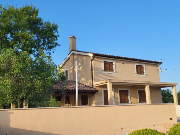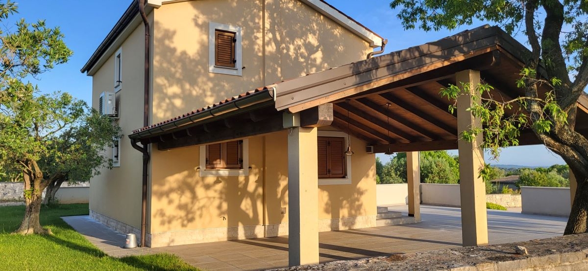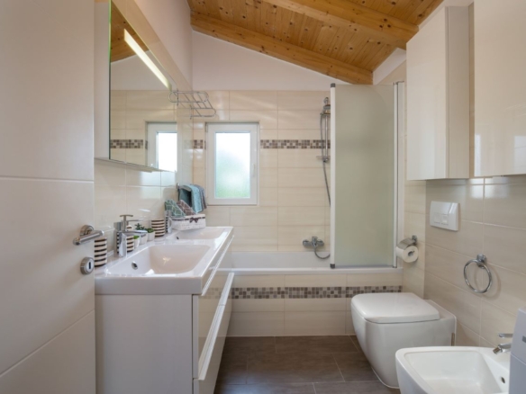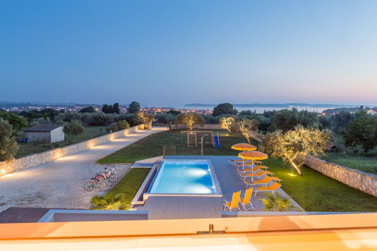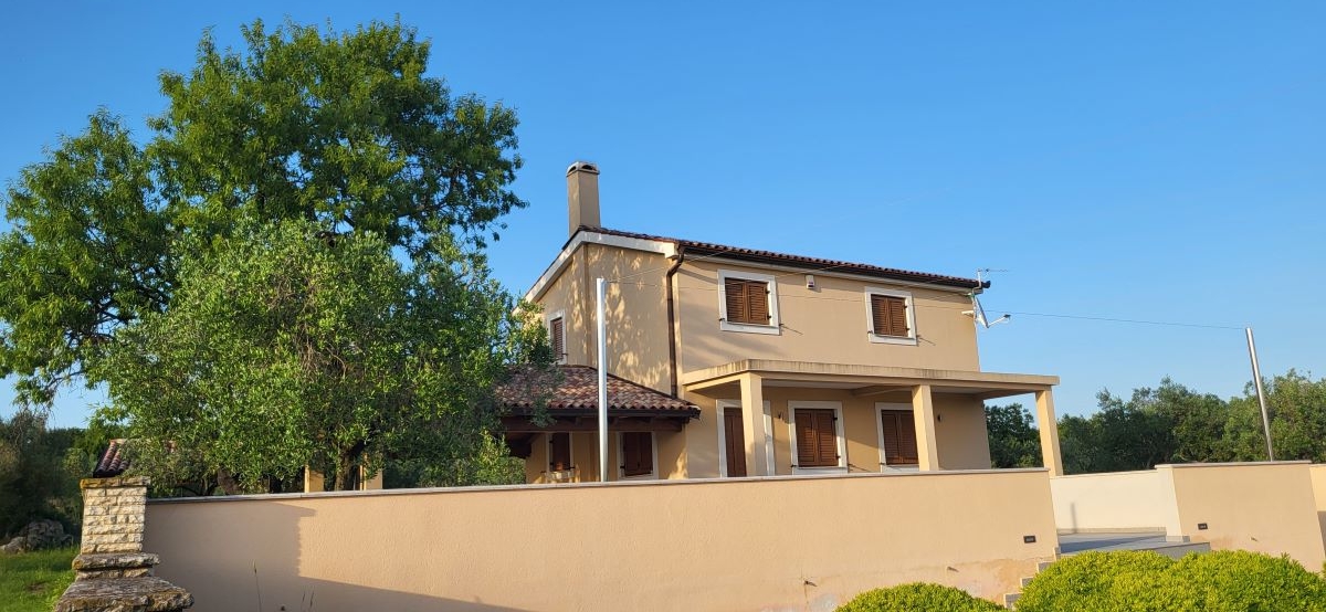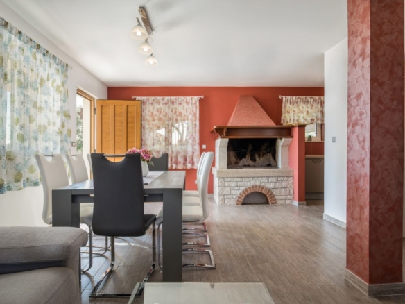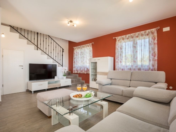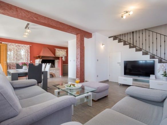 Das Haus selber bietet auf 180m2 Wohnfläche alles was man braucht: unten grosses Wohnzimmer, Esszimmer, Küche – schön gestaltet auch mit offenem Kamin. Dann darüber drei Schlafzimmer mit Bädern. In erlesener Keramik und Steinböden! Mit gigantischem Ausblick auf Fazana, die Brioni-Inseln und das Meer – vom Obergeschoss fast schon irreal!