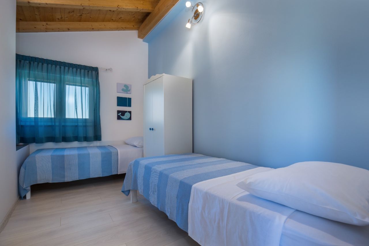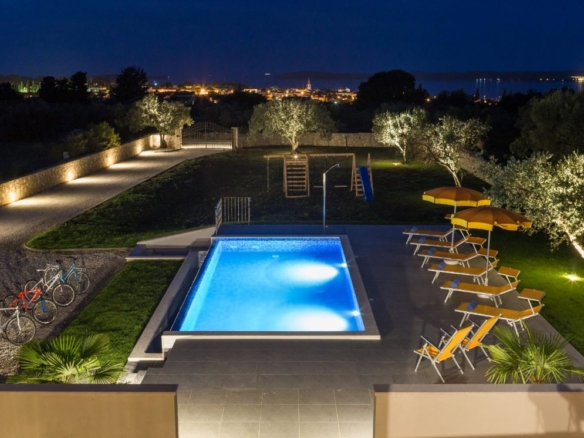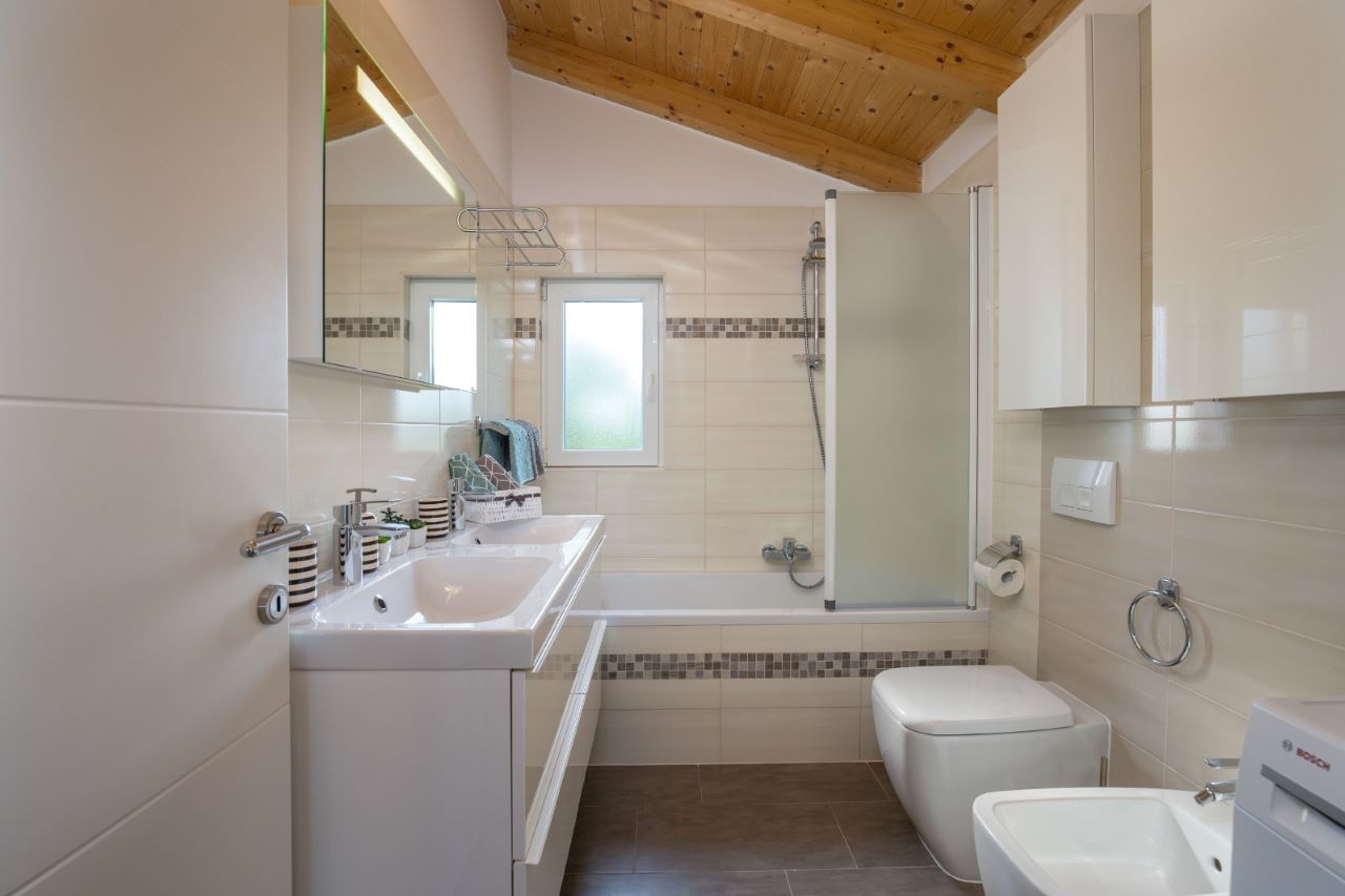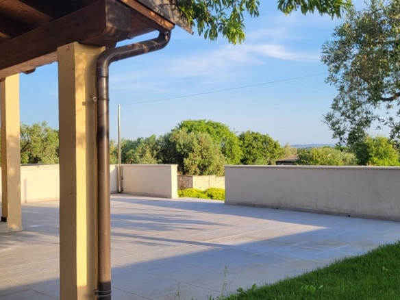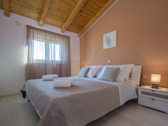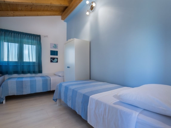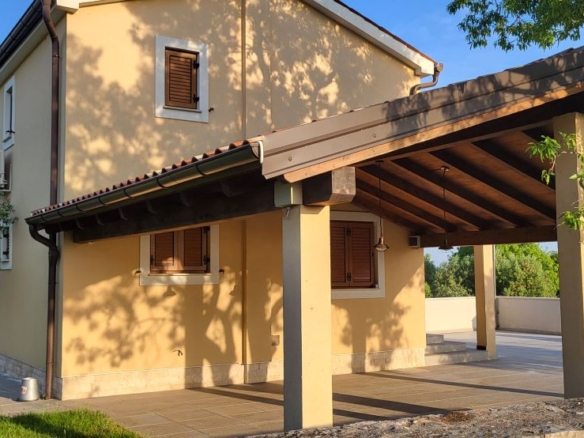 Das Haus selber bietet auf 180m2 Wohnfläche alles was man braucht: unten grosses Wohnzimmer, Esszimmer, Küche – schön gestaltet auch mit offenem Kamin. Dann darüber drei Schlafzimmer mit Bädern. In erlesener Keramik und Steinböden! Mit gigantischem Ausblick auf Fazana, die Brioni-Inseln und das Meer – vom Obergeschoss fast schon irreal!