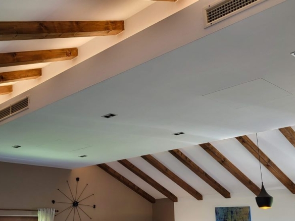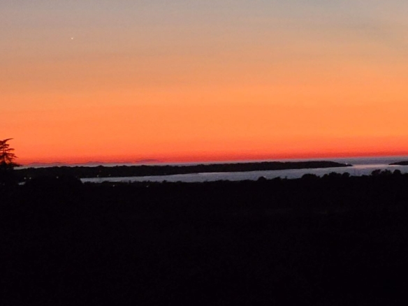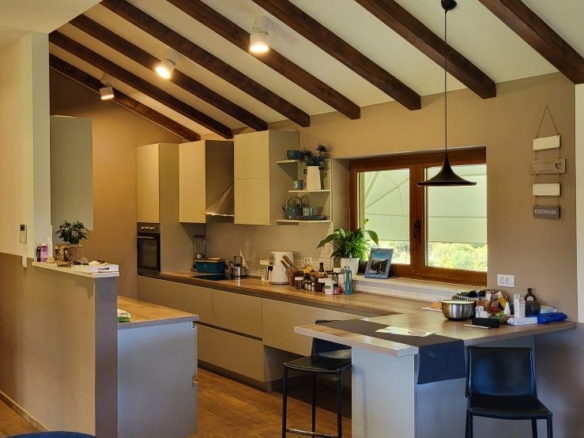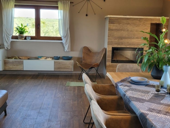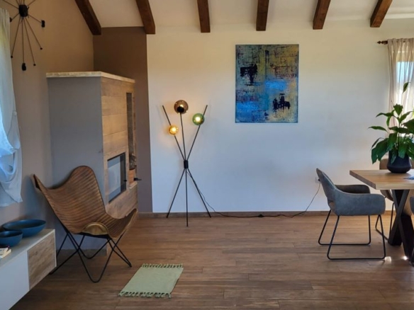 Die Innenarchitektur im Obergeschoss besticht durch grossartiges Design: Kühlung an der Decke, mit Holztram und toller Beleuchtung schaffen samt offenem Kamin ein unglaubliches Wohnfeeling. Vom Wohnzimmer geht’s direkt auf die riesige überdachte Terrasse mit Meerblick und Blick auf die Brijuni-Inseln. Wirklich MEGA, besonders der Sonnenuntergang am Abend!
