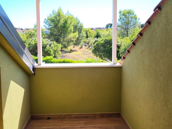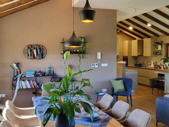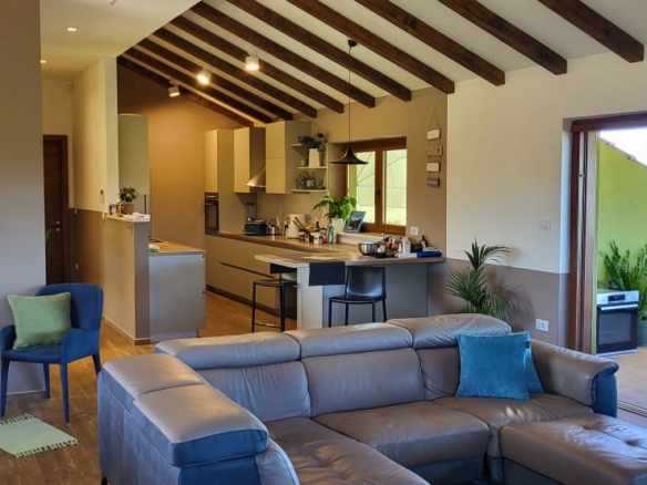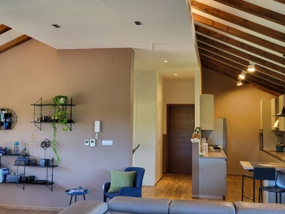 Im Obergeschoss sind ein grosses Wohnzimmer / Esszimmer / Küche, zwei Schlafzimmer, zwei Bäder und zwei Terrassen.