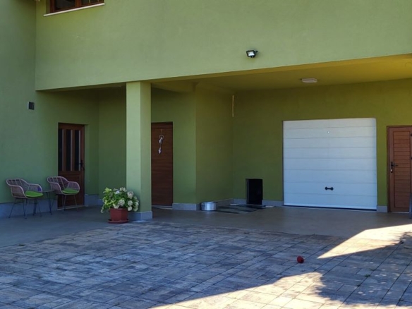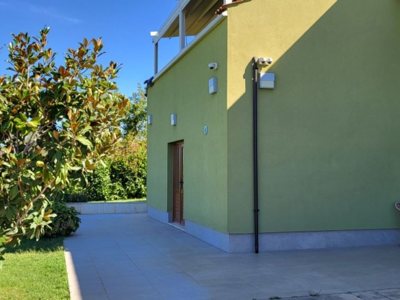 Das Areal ist geschützt durch einen hohen Zaun, alles in Beton und teilweise auch mit dichter grüner Hecke. Es gibt ein Video-Überwachungssystem und Alarmsystem. Zum Haus kommt man durch eine eigene Zufahrtsstrasse – dann zu einem grossen elektrisch gesteuertem Einfahrtstor. Im Garten bei den Olivenbäumen sind für den Dekor einige Lampen eingebaut – sehr angenehm dann am Abend von der grossen Terrasse des Hauses zu betrachten.