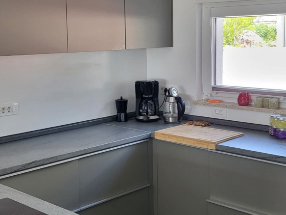 Der Pool bietet genug Liegeflächen rundum, das Grundstück ist überschaubar, dass des wenig Arbeit mit dem Garten verursacht. Auf der Seite wo der Hauseingang ist, gibt’s Parkplätze für 4 PKW, auch sonst kann man im Umfeld parken.