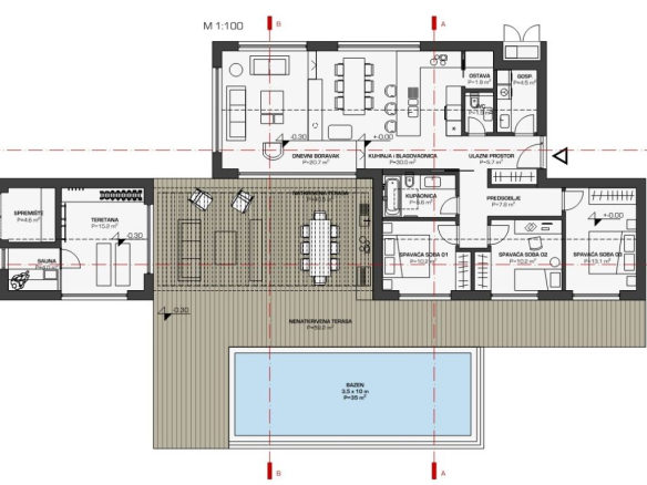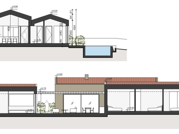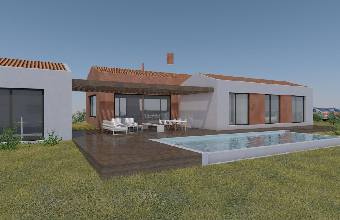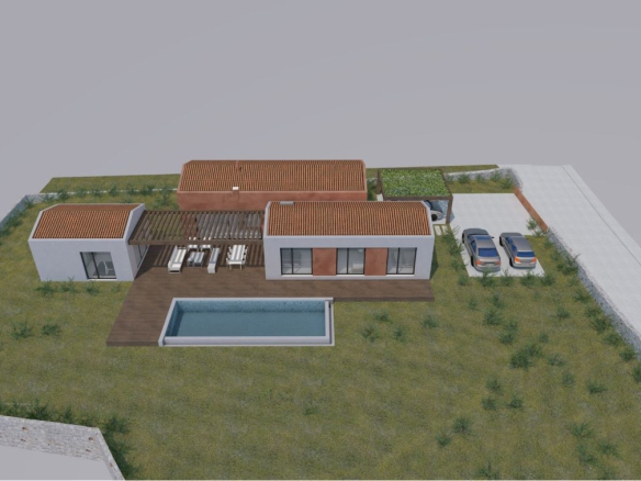 Das geplante Haus im Stile moderner Architektur ist ebenerdig modern in 2 Bungalows verbunden. Es hat wahlweise 2-3 Schlafzimmer oder eben auch einen Fitnessraum, ein grosses Pool, sogar eine Sauna ist geplant und eine Wohnfläche von gesamt 170m2 netto! Hier kann dann bald zu bauen begonnen werden!