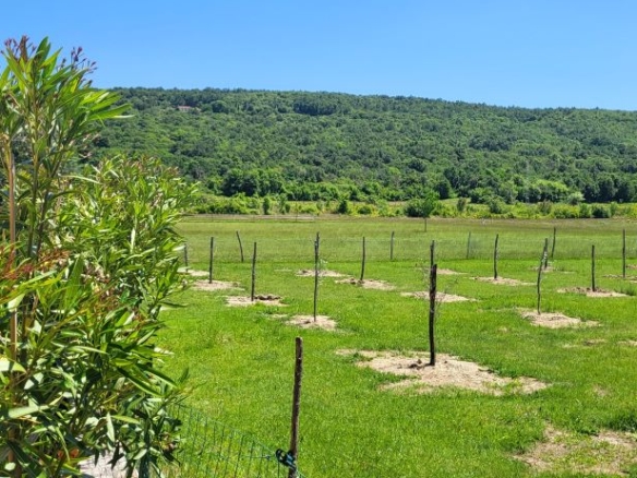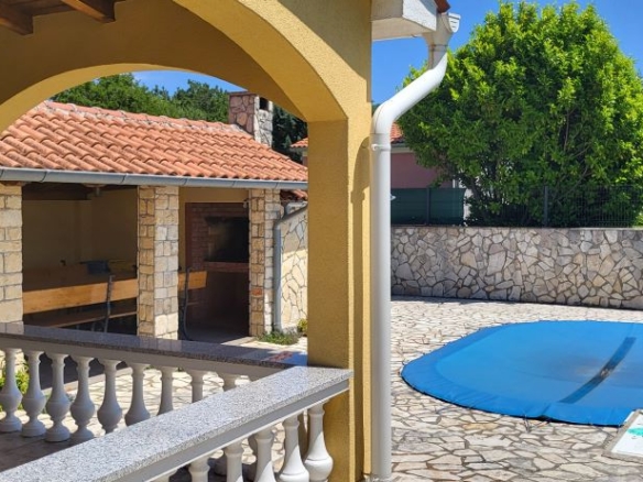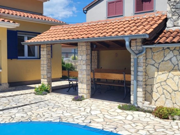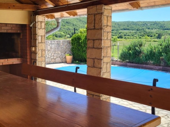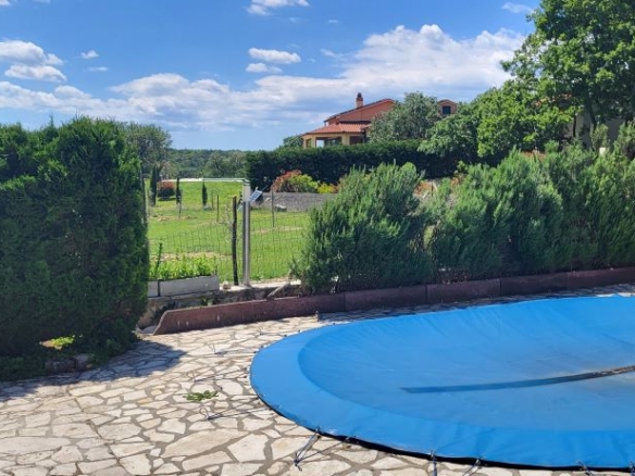 Pool, überdachte Terrasse, eigenes Grillhaus / BBQ-Haus mit grosser Terrasse, eigener Lagerhütte für Gartenmöbel im privaten Bereich – mit Blick auf die Olivenplantagen am Nachbargrundstück, das Agrarland ist. Vor dem Haus ein grosses Einfahrtstor und Parkzone für bis zu 4 Autos. Vom Einfahrsbereich bis zum Garten – alles in schönen istrischen Steinen gepflastert!