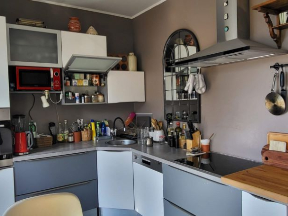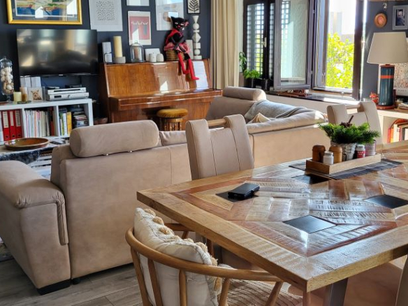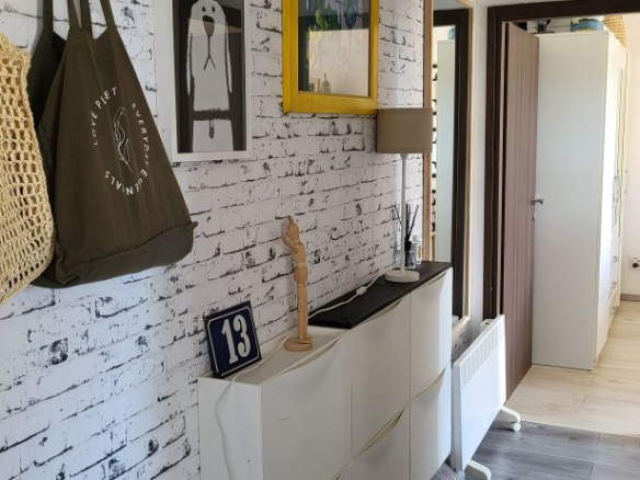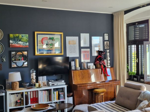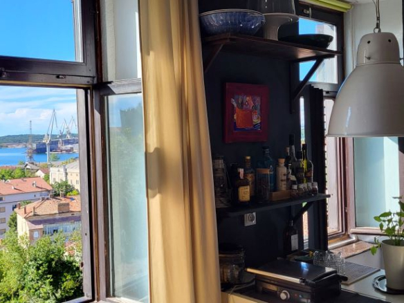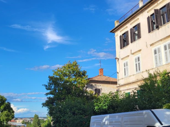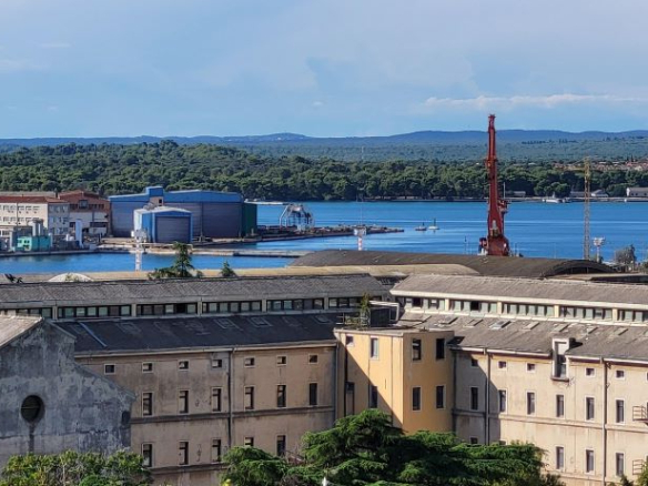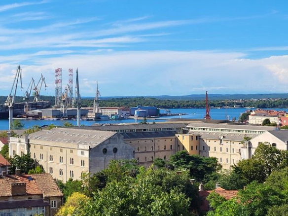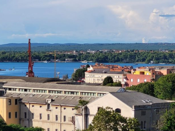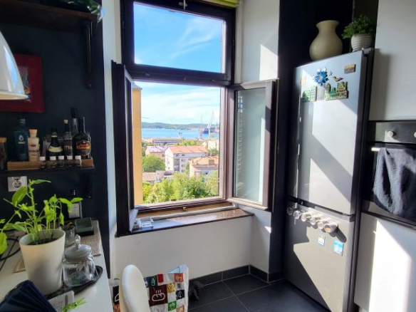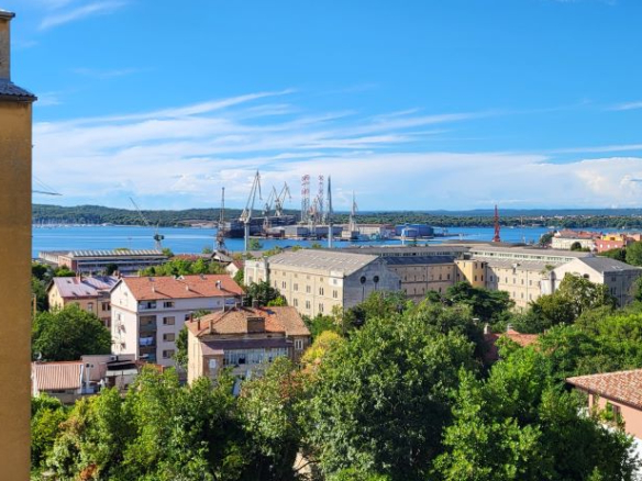 Das Apartment befindet sich im zweiten Stock im Obergeschoss. Und die Besonderheit: die gesamte vordere Fensterfront bilden die 70m2 der Wohnung.Die Lage ist phänomenal: etwas am Hang gelegen, über dem ehemaligen Maximilianpark im Stadtteil Veruda. Komplett ruhig ohne Durchzugsverkehr am Ende einer Sackgasse. Geschäfte, Cafes, Restaurants sind im Umfeld zu Fuss zu erreichen, und auch zum nächsten Strand sind es nur knapp 1km.