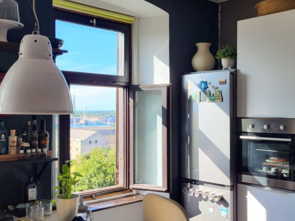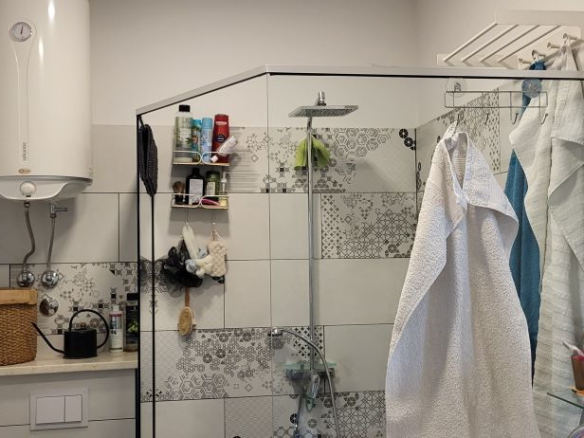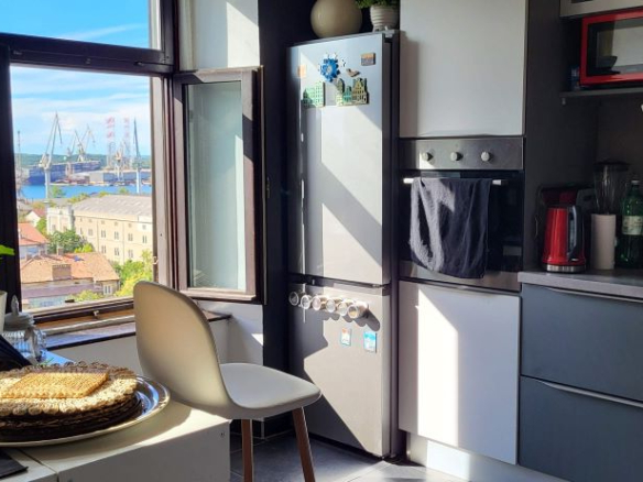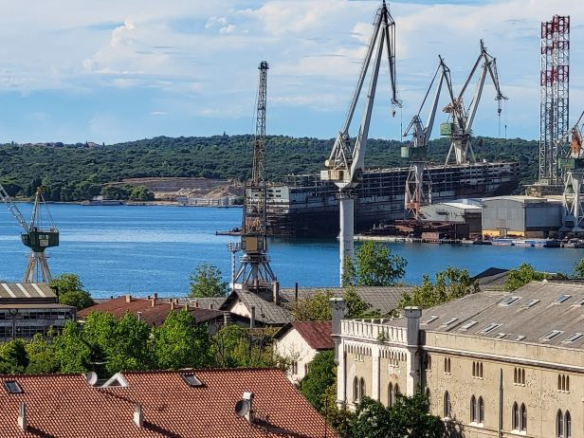 Es gibt ein grosses Wohnzimmer mit schöner offener Küche, ein grosses Badezimmer / WC, und zwei weitere Räume – aktuell ein Schlafzimmer und ein Kinderzimmer. Das wirklich Einmalige dieser Wohnung: durch die vielen Fenster haben alle Räume sehr viel Licht – direkte Sonneneinstrahlung nur bei Sonnenuntergang – und alle Räume haben einen herrlichen Ausblick auf Pula, den Hafen und das Meer!